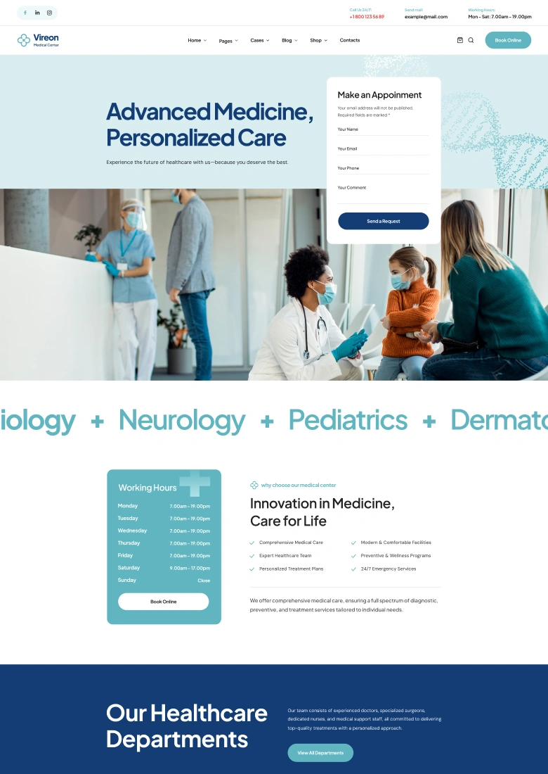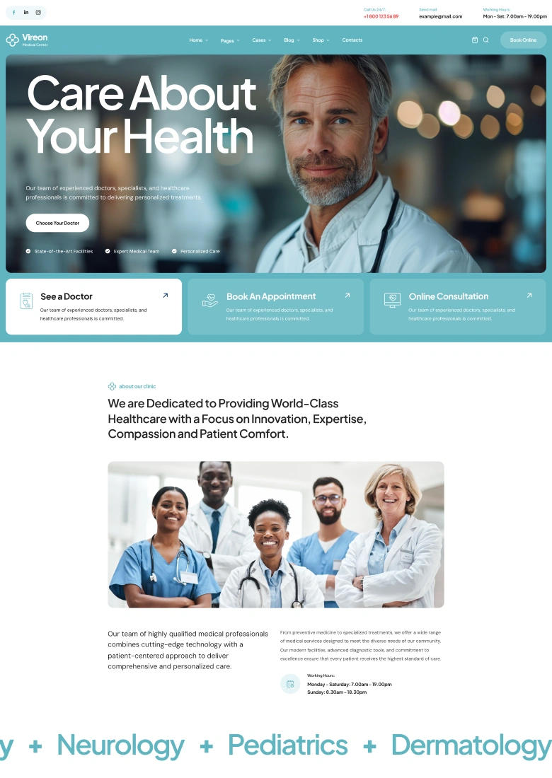 Our medical clinic is dedicated to providing top-tier healthcare with a focus on innovation, expertise, and patient comfort. We offer comprehensive medical care, ensuring a full spectrum of diagnostic.
