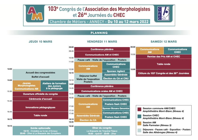 Après l’excellent congrès de Grenoble 2021 malgré le distanciel, nous espérons que nous aurons la joie d’être tous réunis physiquement au bord du lac d’Annecy à l’occasion de notre 103e Congrès de l’Association des Morphologistes et de nos 26es Journées du Collège du CHEC qui se tiendront à la Chambre de Métiers et de l’Artisanat de la Haute-Savoie à Annecy les 10, 11 et 12 mars 2022.