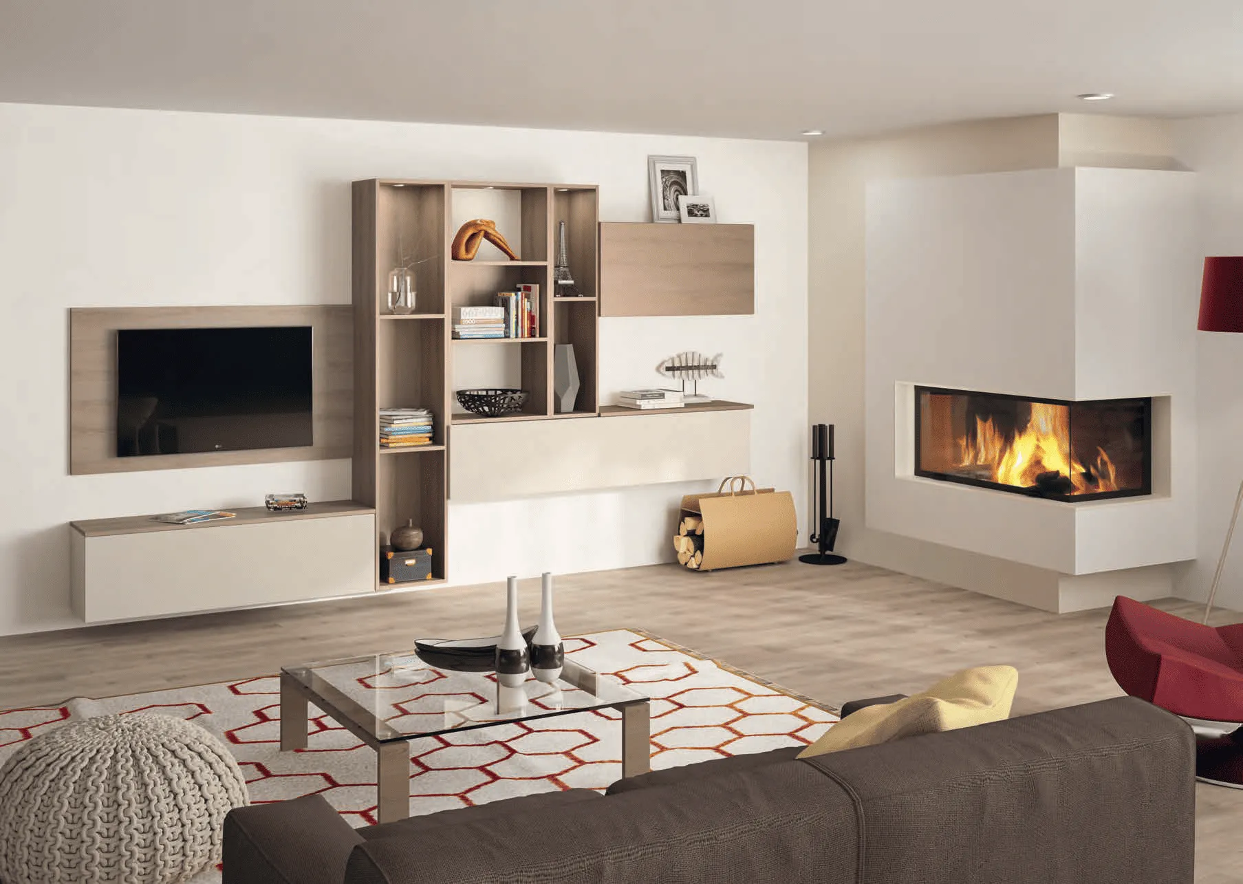 Aménagement présenté avec des cellules mélaminées chêne Milano et façades sense lin mat et mélaminées chêne Milano.